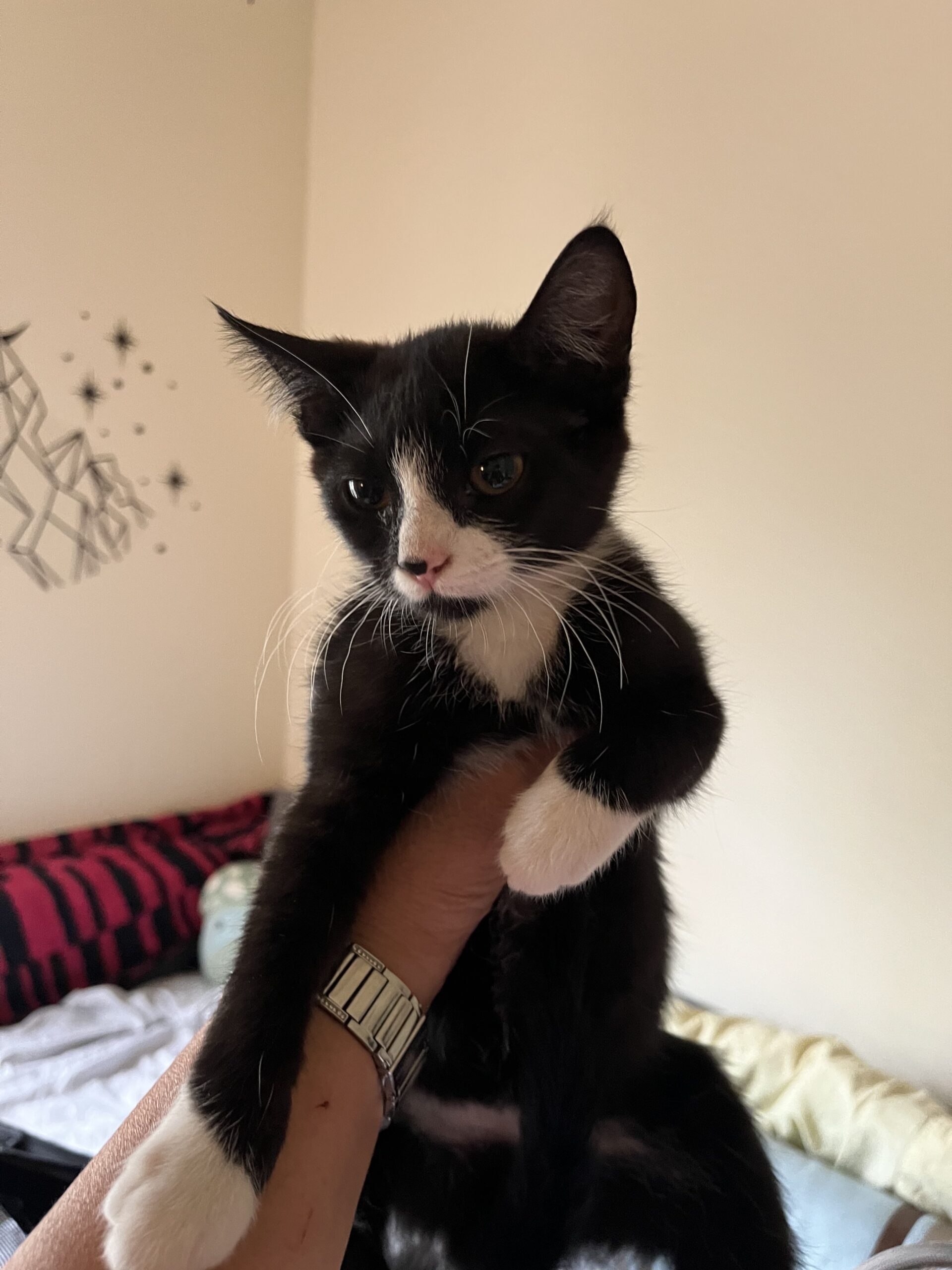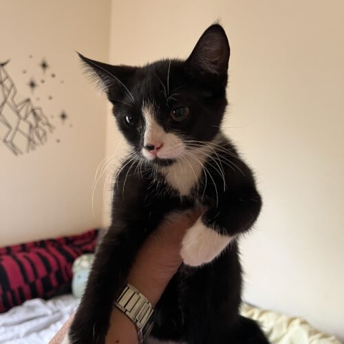 Sia (short for Solensia!) is another one of our adorable tuxedo sisters. She’s playful, curious, and always ready to join in on the fun—whether it’s chasing toys, wrestling with her siblings, or exploring every corner of the room.