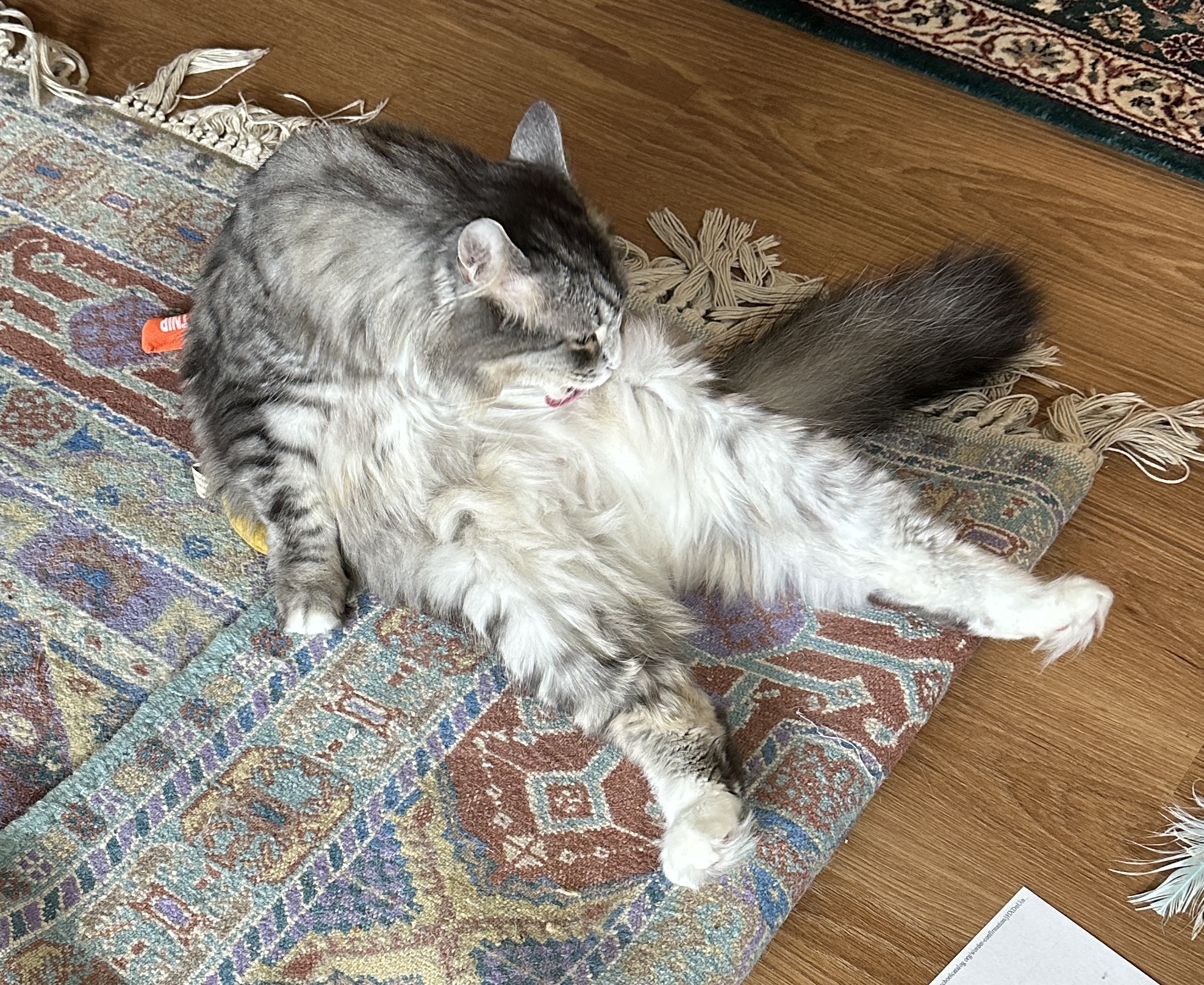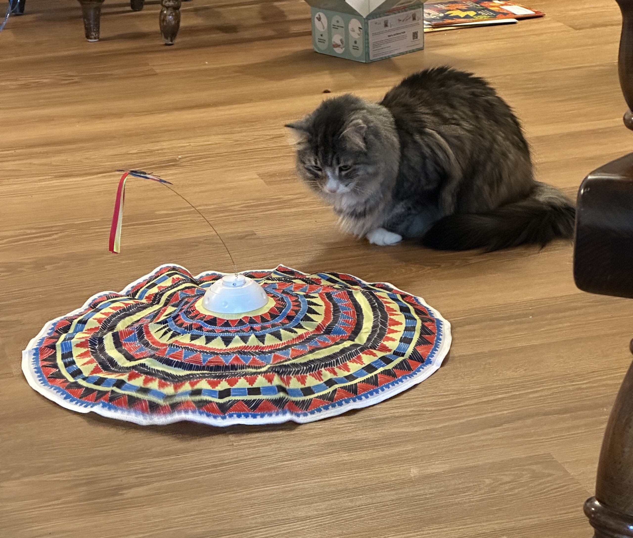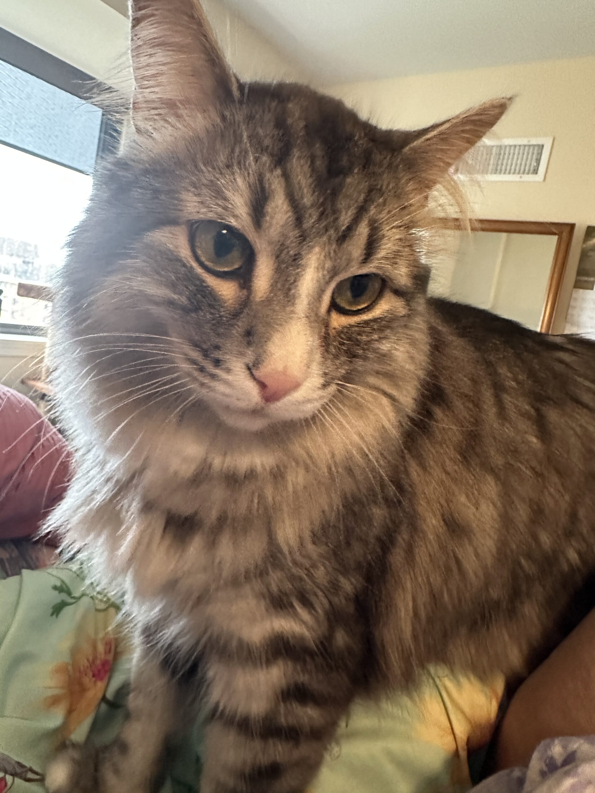 The good news is—I’m making great progress with my foster mom! I no longer hide all day, I’m eating well again, and I’ve started playing with toys—feather wands, ping pong balls, and even electronic games. Sometimes when I’m feeling brave, I’ll gently tap my foster mom’s arm with my paw to ask for a little petting (she loves that!). Sudden movements and new people can still make me nervous, but with time and kindness, I know I’ll keep blossoming.