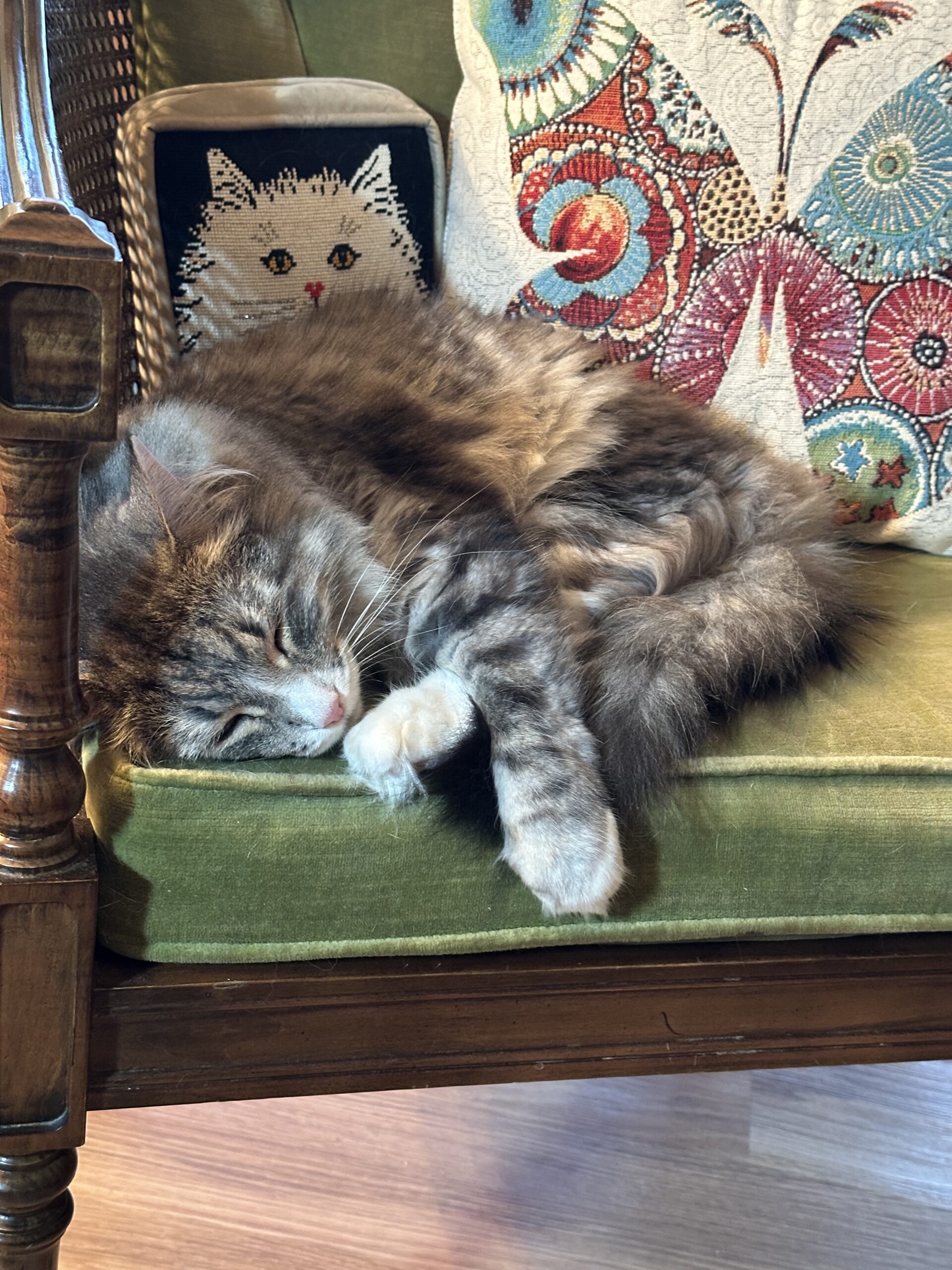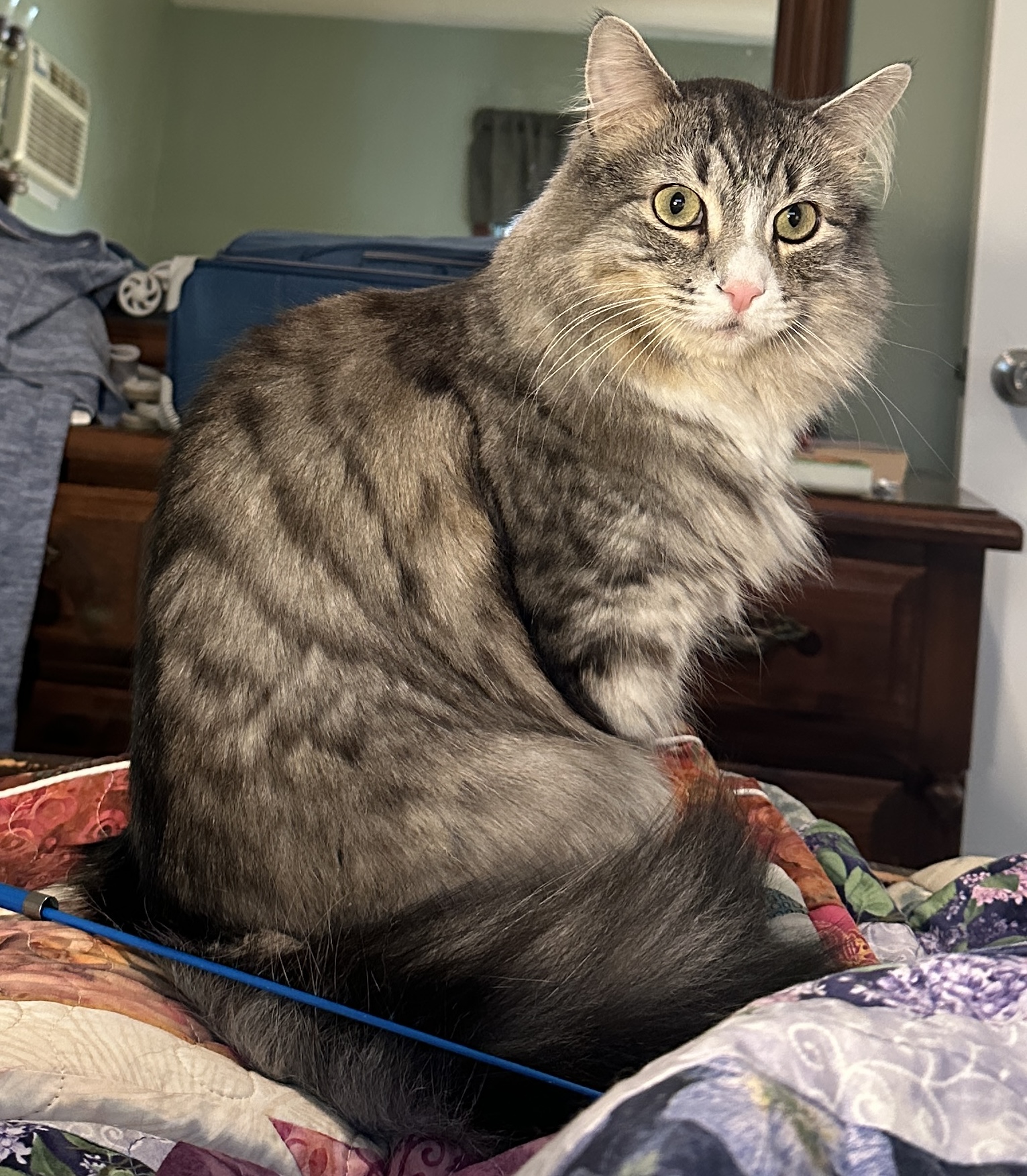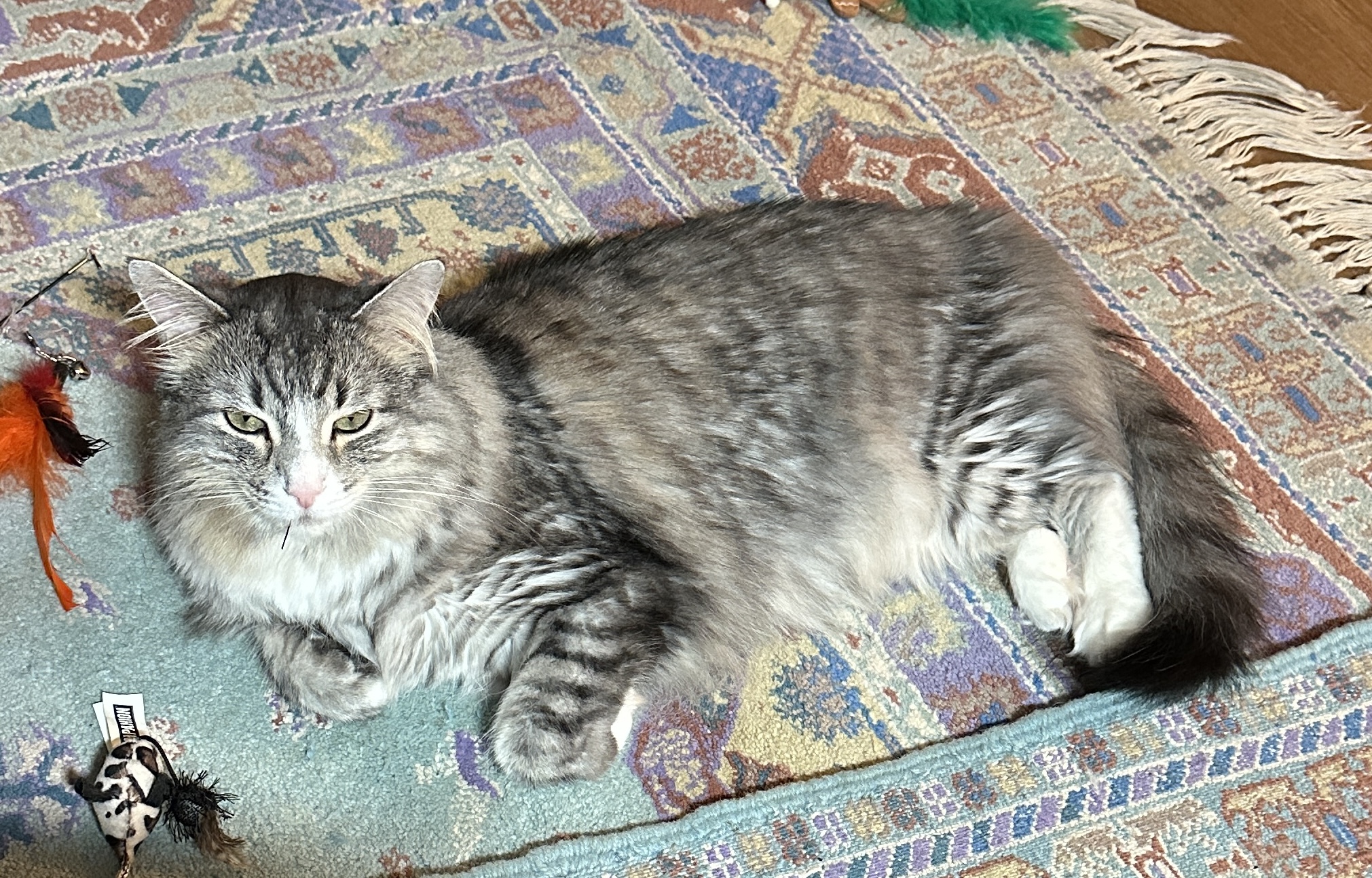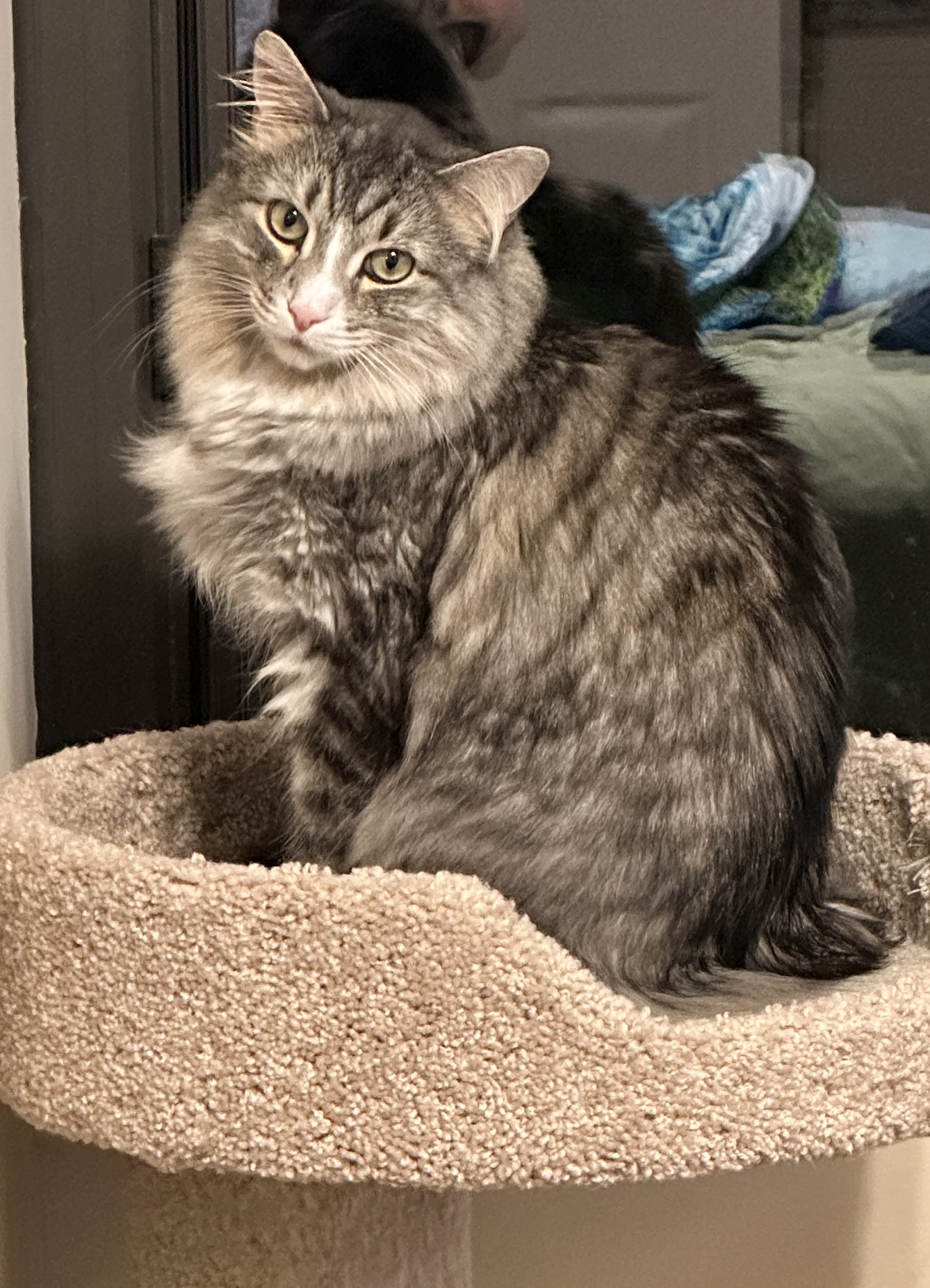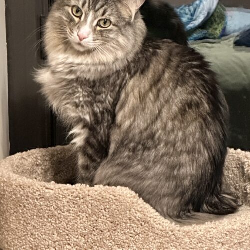 Hi, I’m Alfie – short for Alfalfa (thank goodness, Alfie suits me much better!). I’m a handsome nine-year-old gentleman with some Maine Coon in my family tree—just look at my pictures and you’ll probably see it, too. I’m a gray tabby with white paws and little black patches on my back feet, with a soft, silky coat that’s a joy to pet. Even though I keep myself well-groomed, I love it when someone brushes me.
