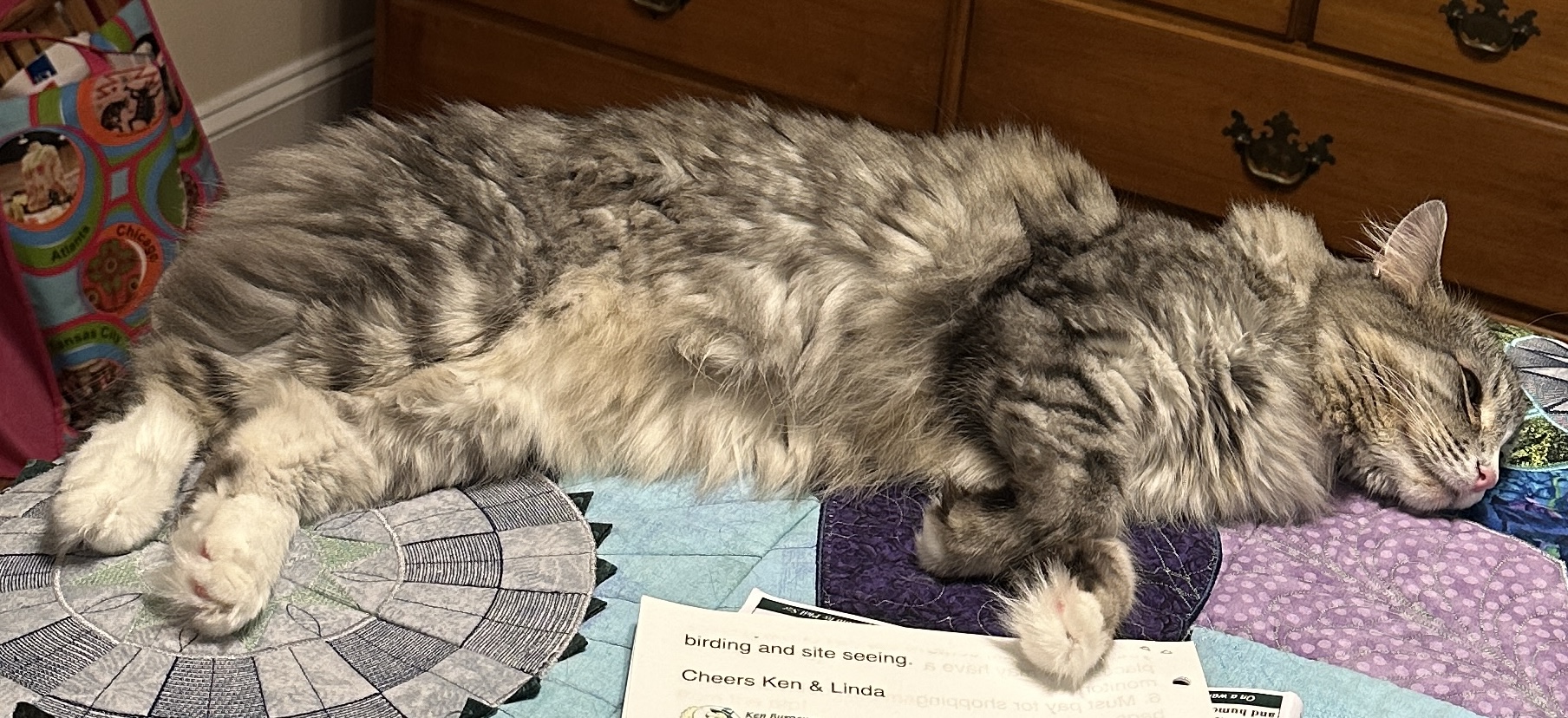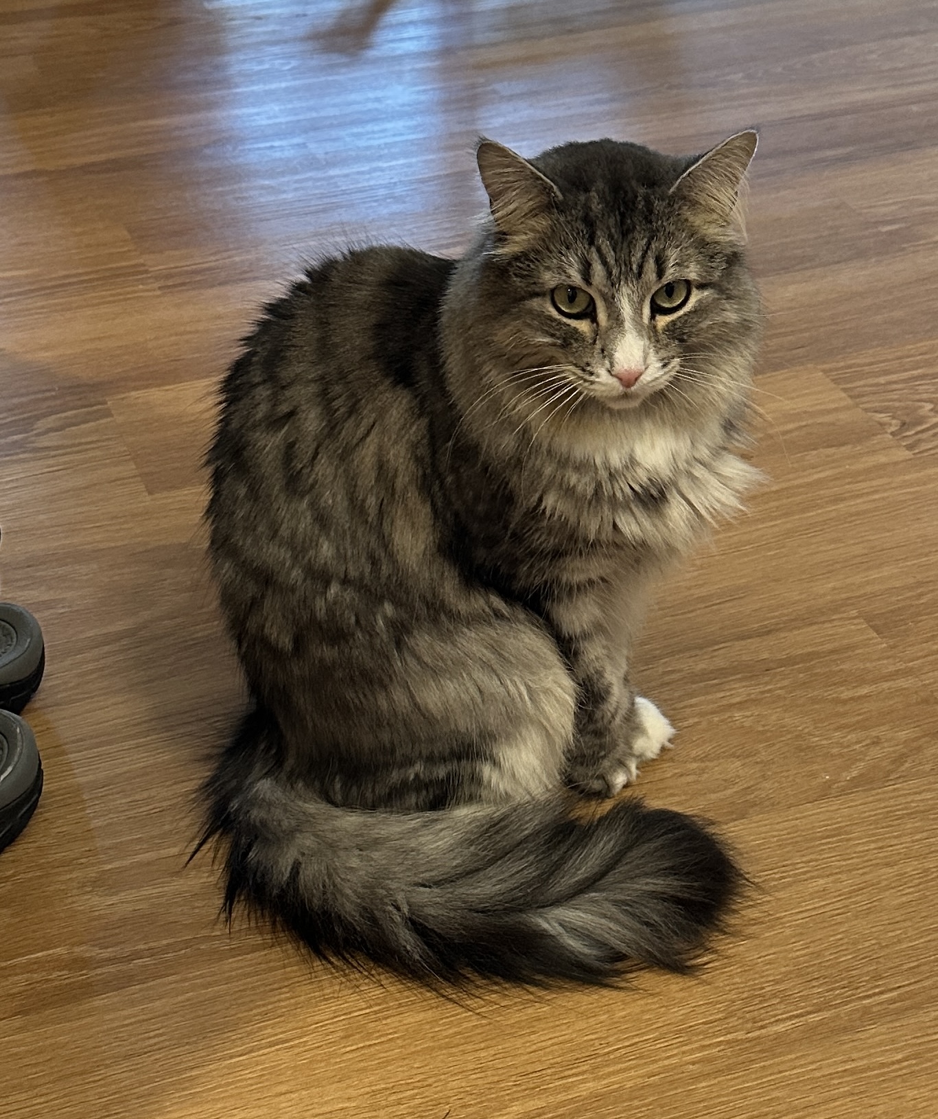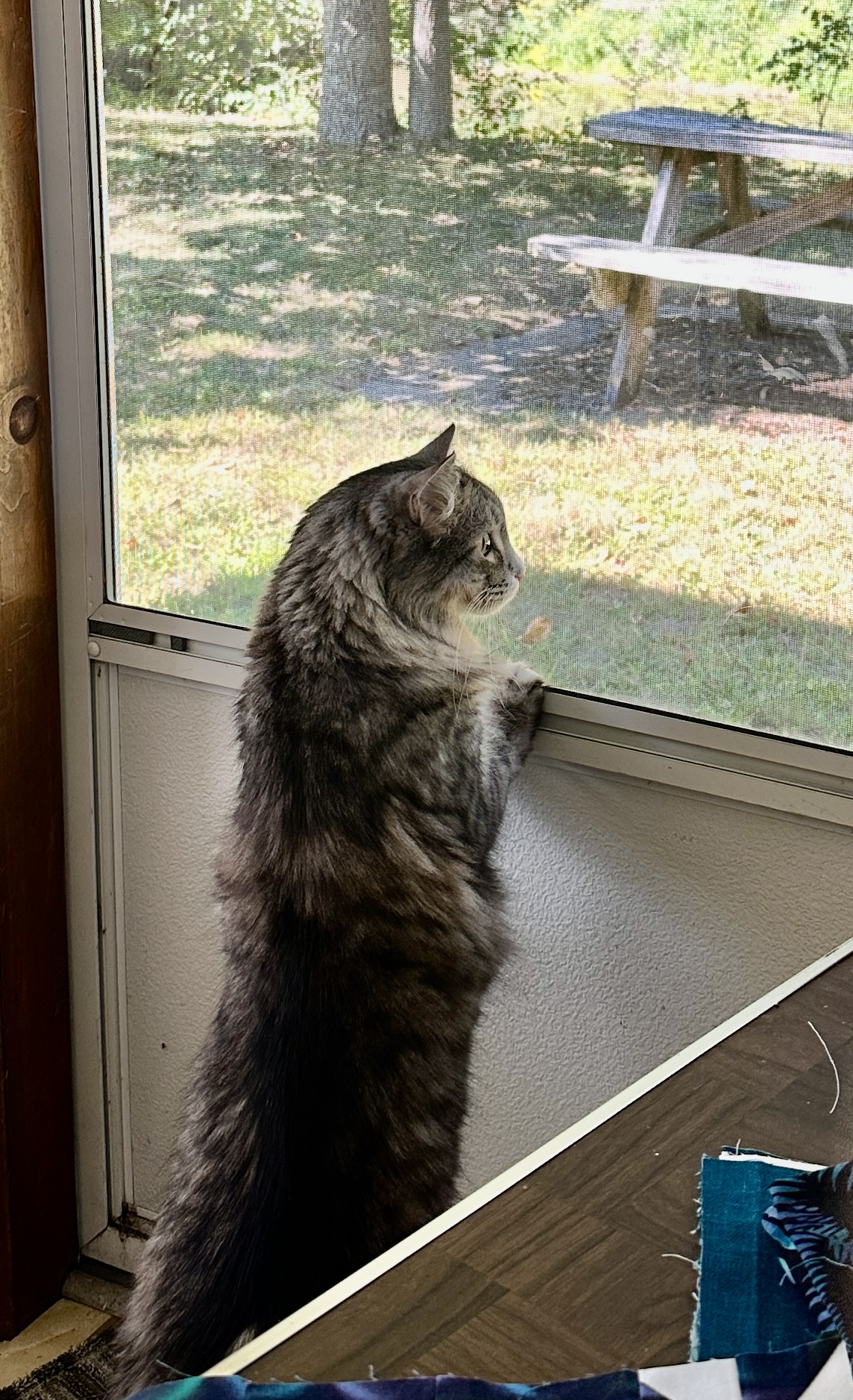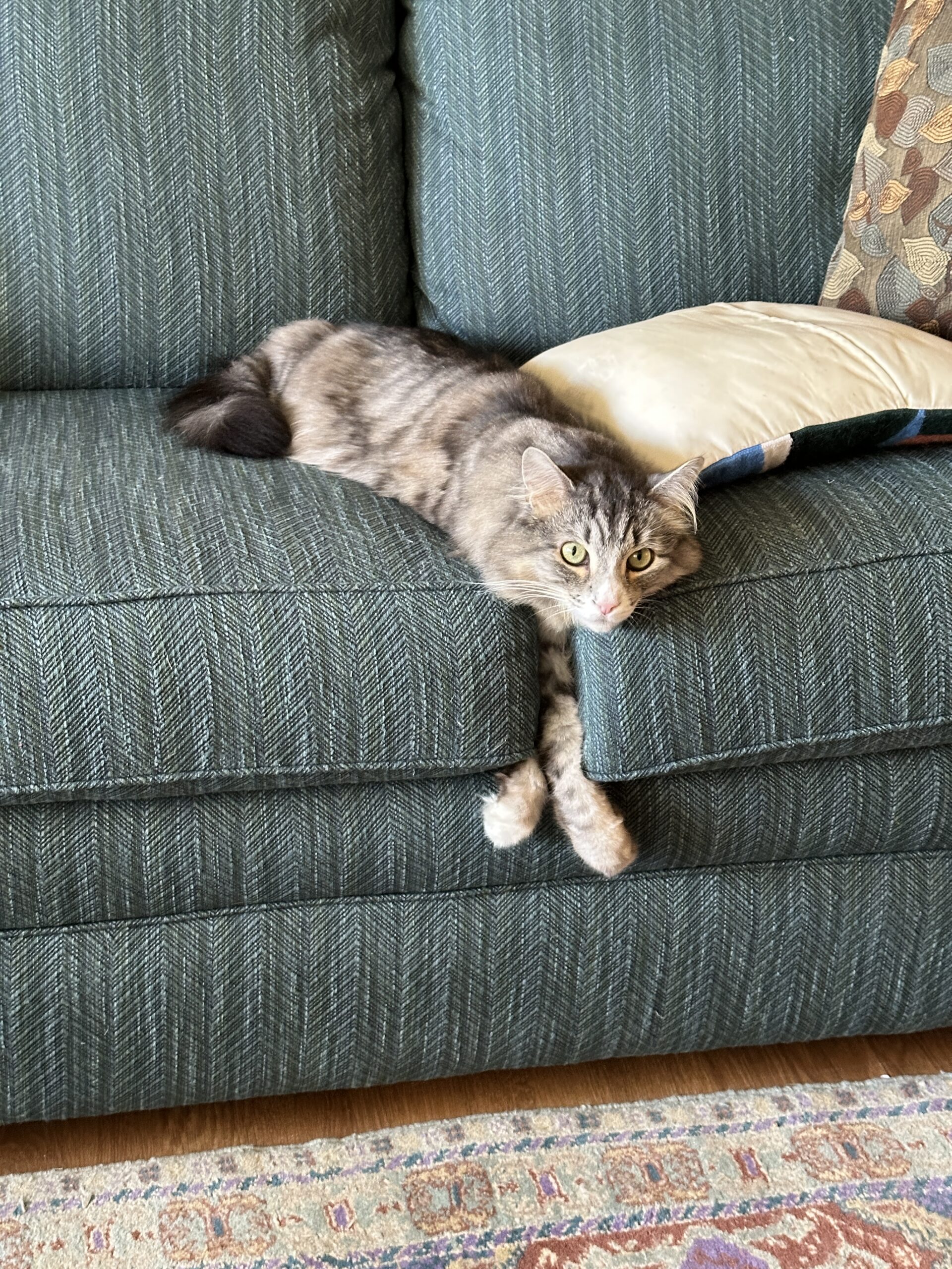 Hi, I’m Alfie – short for Alfalfa (thank goodness, Alfie suits me much better!). I’m a handsome nine-year-old gentleman with some Maine Coon in my family tree—just look at my pictures and you’ll probably see it, too. I’m a gray tabby with white paws and little black patches on my back feet, with a soft, silky coat that’s a joy to pet. Even though I keep myself well-groomed, I love it when someone brushes me.