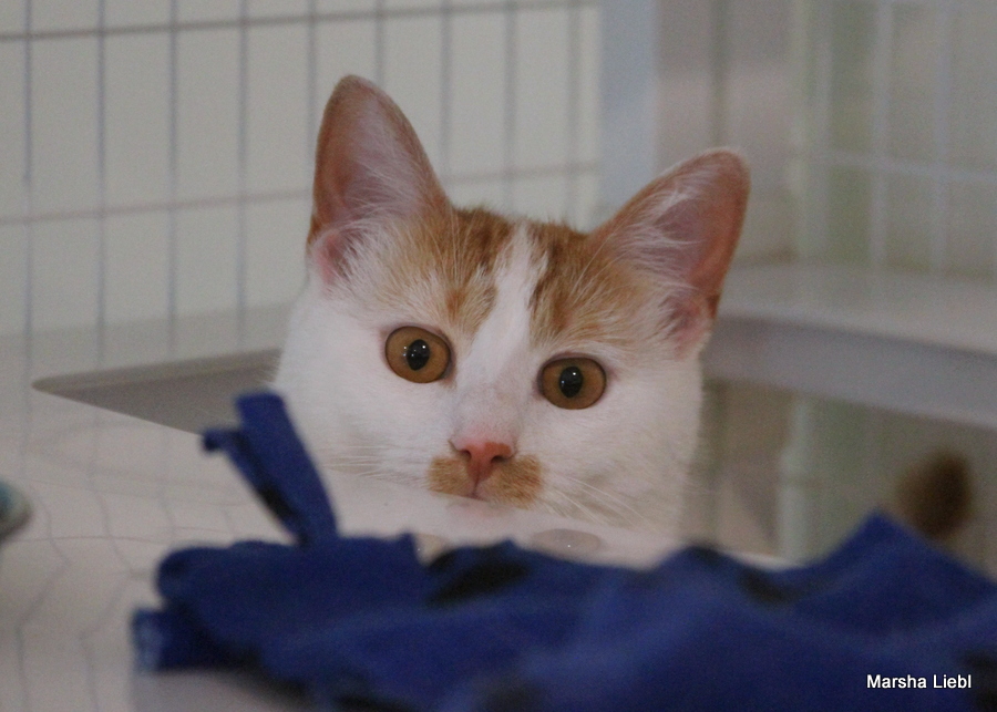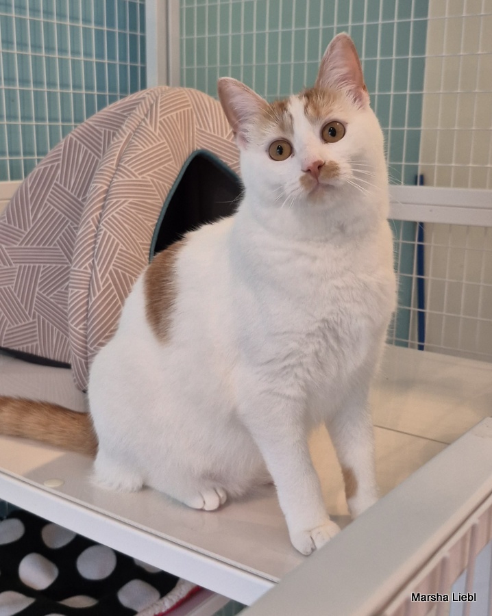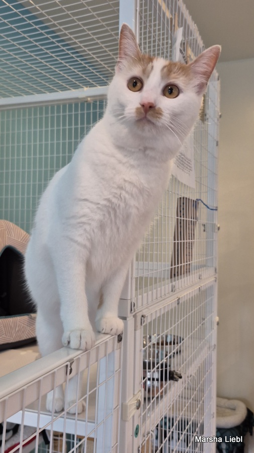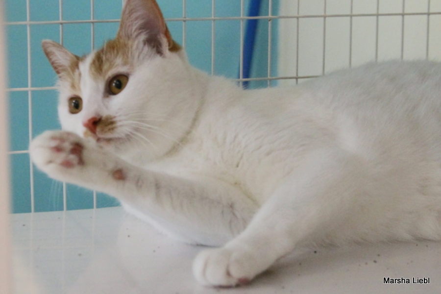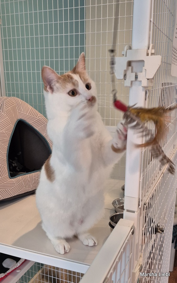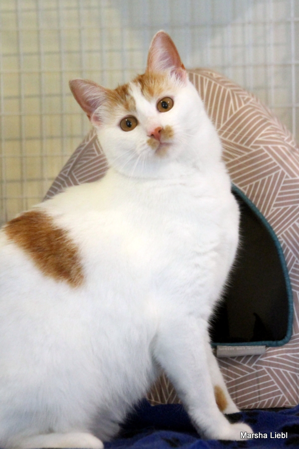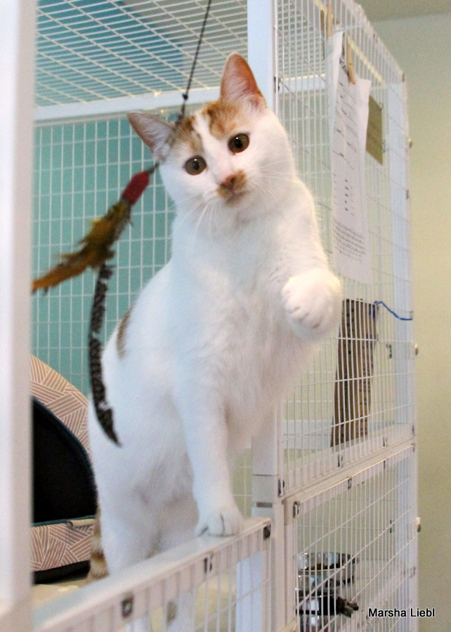 My name is Callie, but I have also been called Bubbas and “hey, cat.” Whatever floats your boat! I am a one-year-old calico girl kitty with mostly white fur and adorable orange splotches on my body – I’m cute and I know it – watch me play and show off my agile body! I am looking for a new home because the resident older cat didn’t want to be friends with me – and he had seniority. -but I was way cuter! Life isn’t always fair, is it?