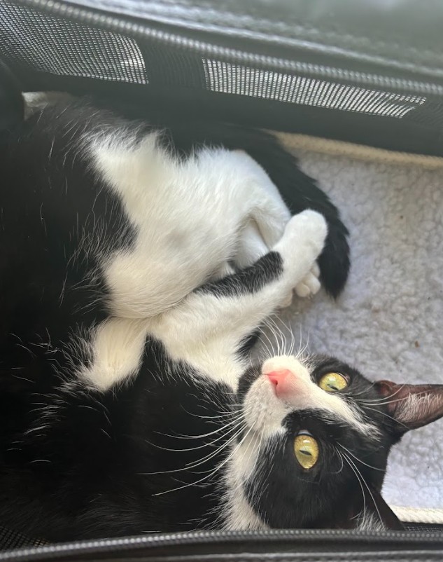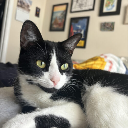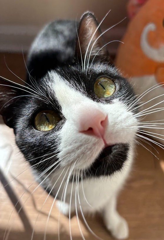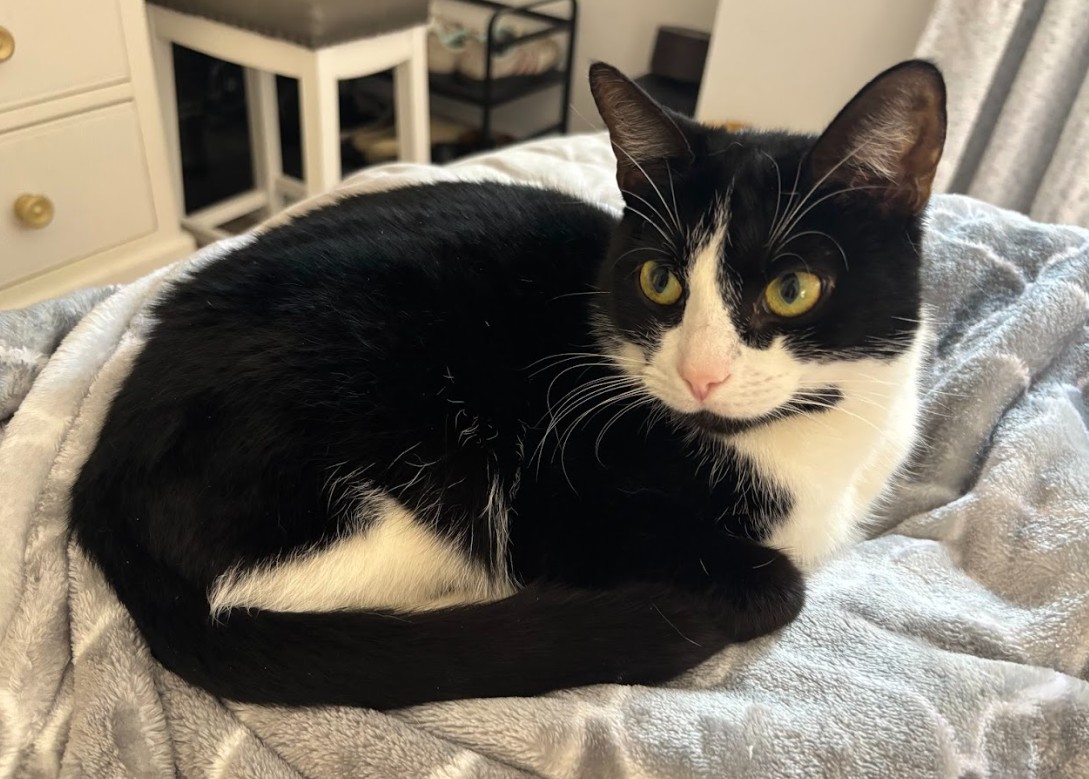 Hello, darling. I’m Dutchess — named because my dad thought I deserved something royal (and he treats me accordingly). I’m a three-year-old tuxedo lady with striking yellow-green eyes and a personality to match.
