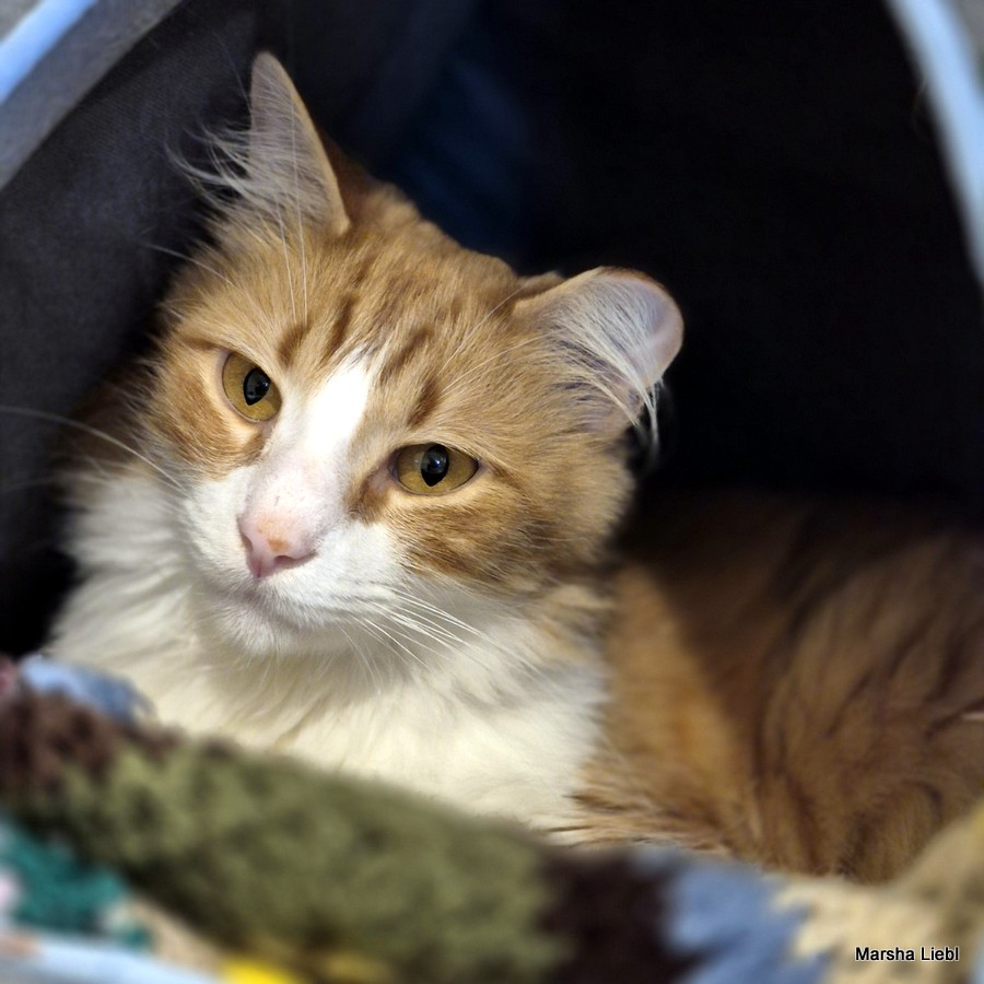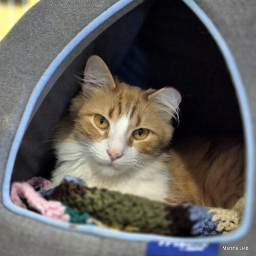 Hi there, I’m Alex — a 2-year-old orange and white boy with a soft, medium-length coat. My sister Basia and I are very bonded, so we’re hoping to find a forever home together. We’ve had to say goodbye to our person, who can’t care for us anymore, but we’re ready for our next adventure.