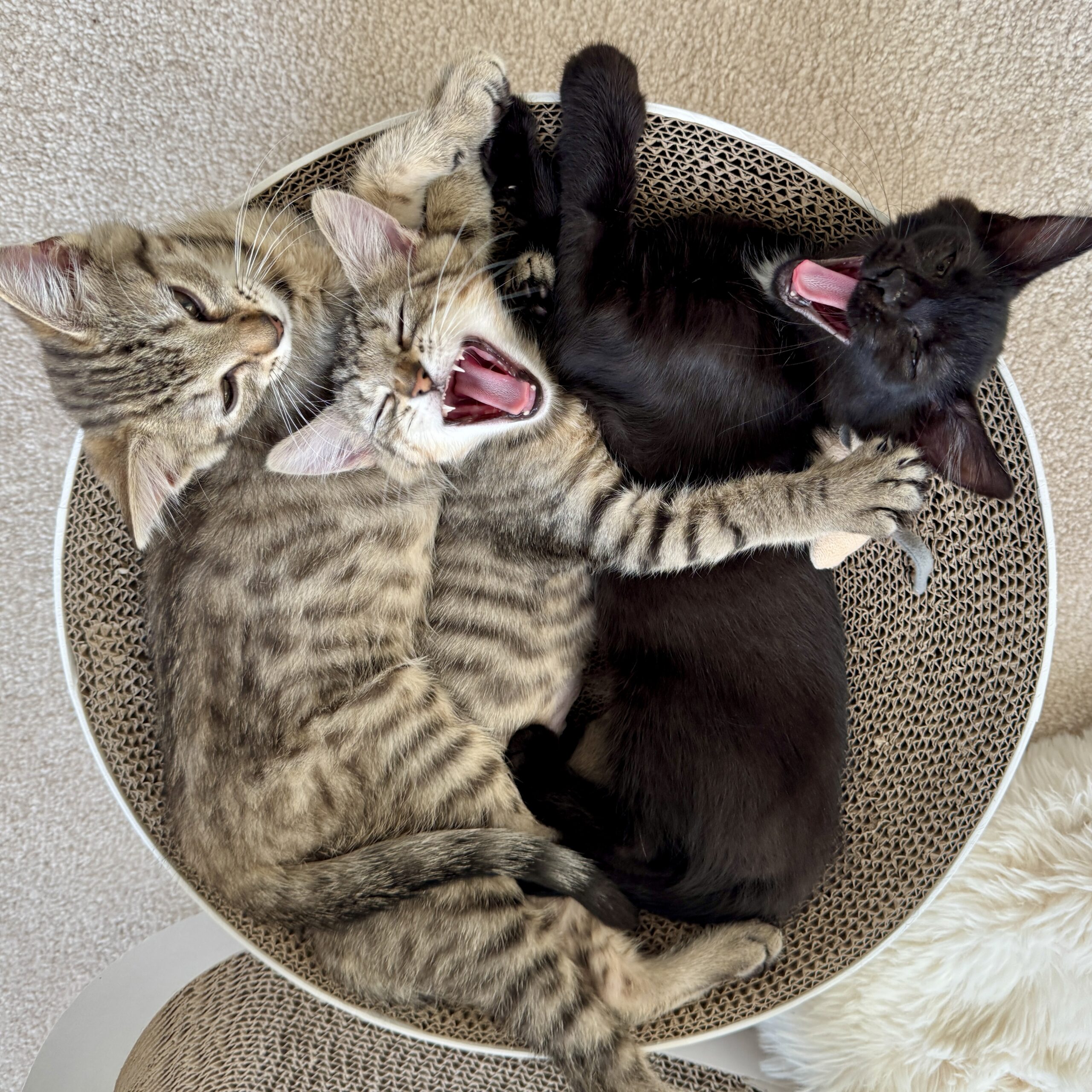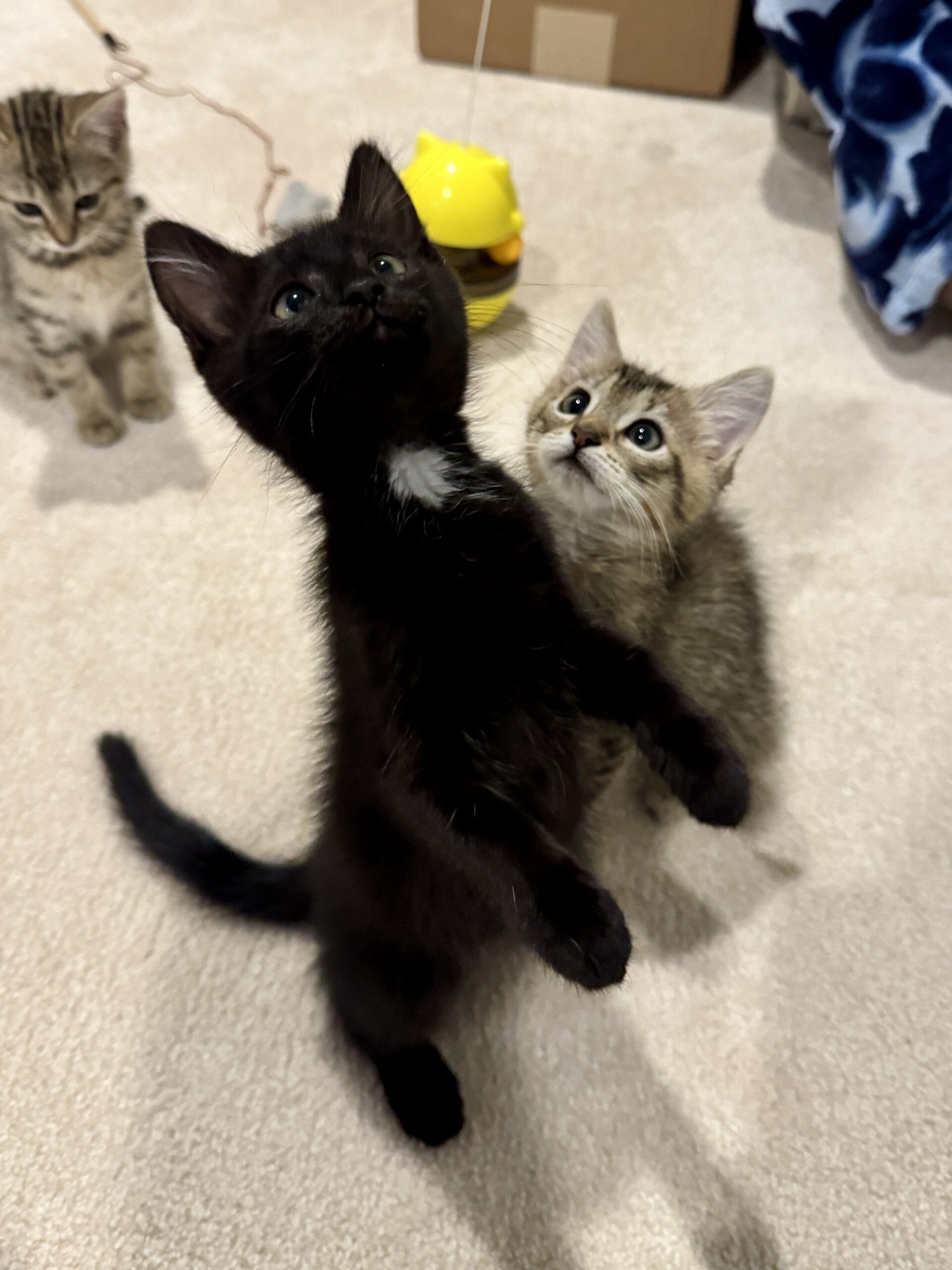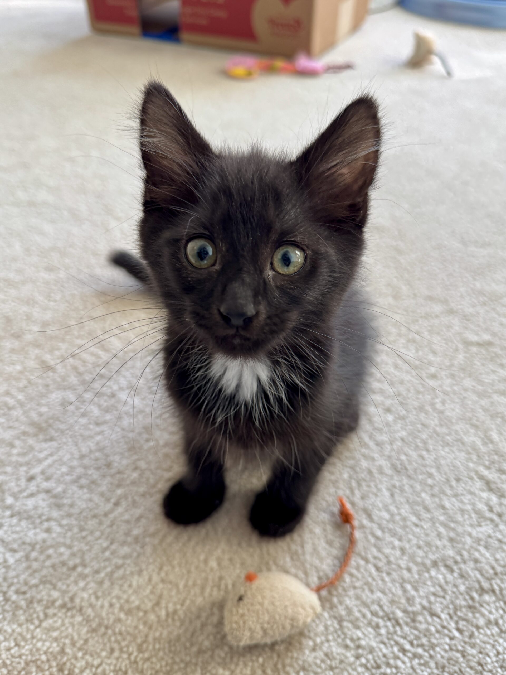 Nova is an incredibly lively and playful black kitten who loves to interact with every cat around her. She is extremely affectionate and adores people—whenever she catches your eye, no matter what she’s doing, she will immediately stop and come over to you. Just a simple thigh pat is enough for her to jump up and keep you company. When you gently stroke her, she purrs contentedly, showing just how much she enjoys your attention. Nova is the most social and energetic kitten of the litter, full of playful energy and always ready for fun. If you’re looking for a lively, loving companion who’s full of personality and always eager to connect, Nova is the perfect kitty for you.