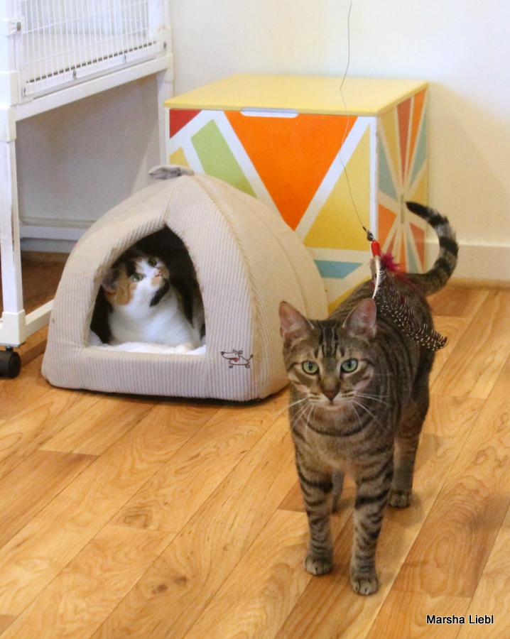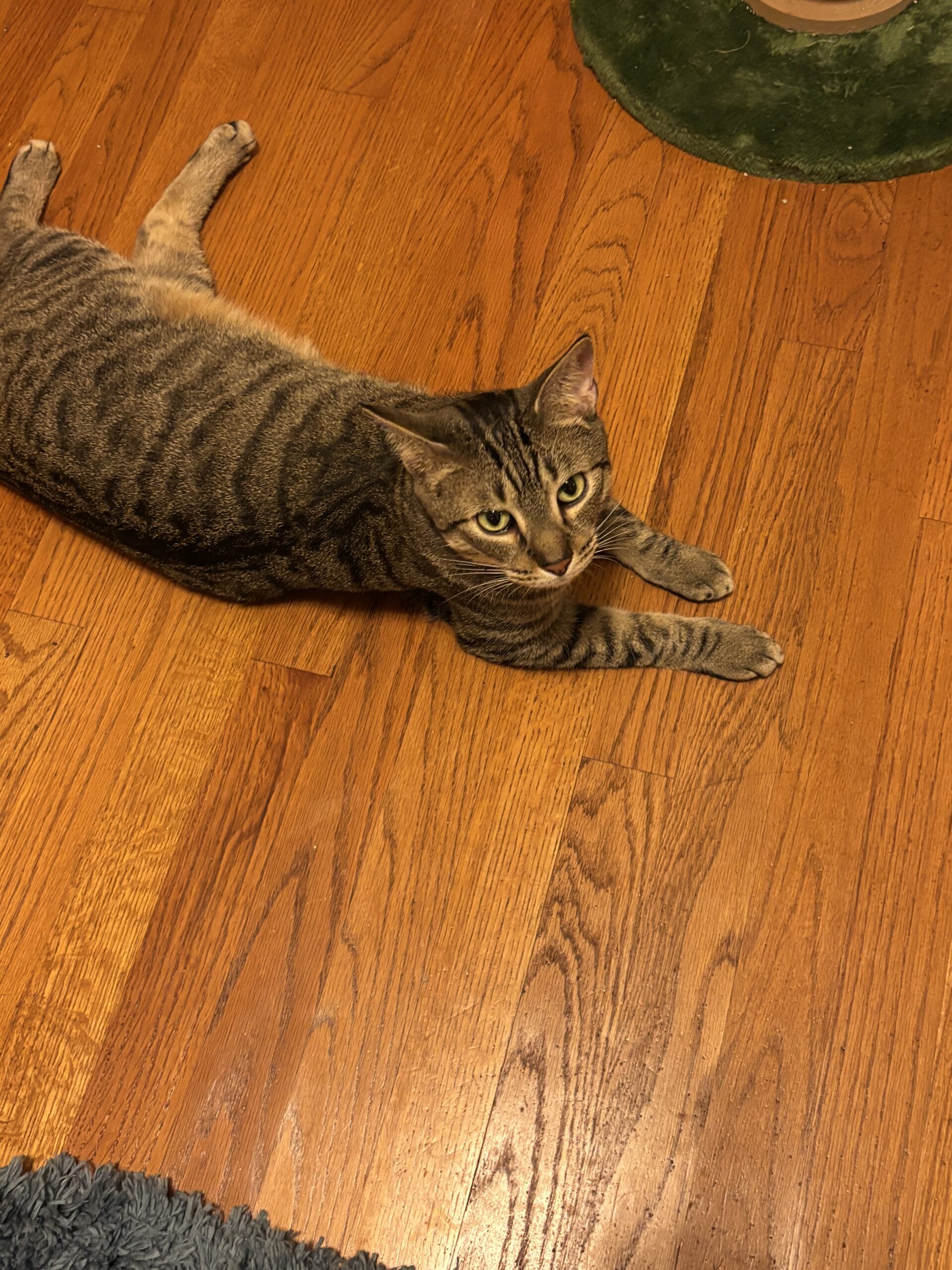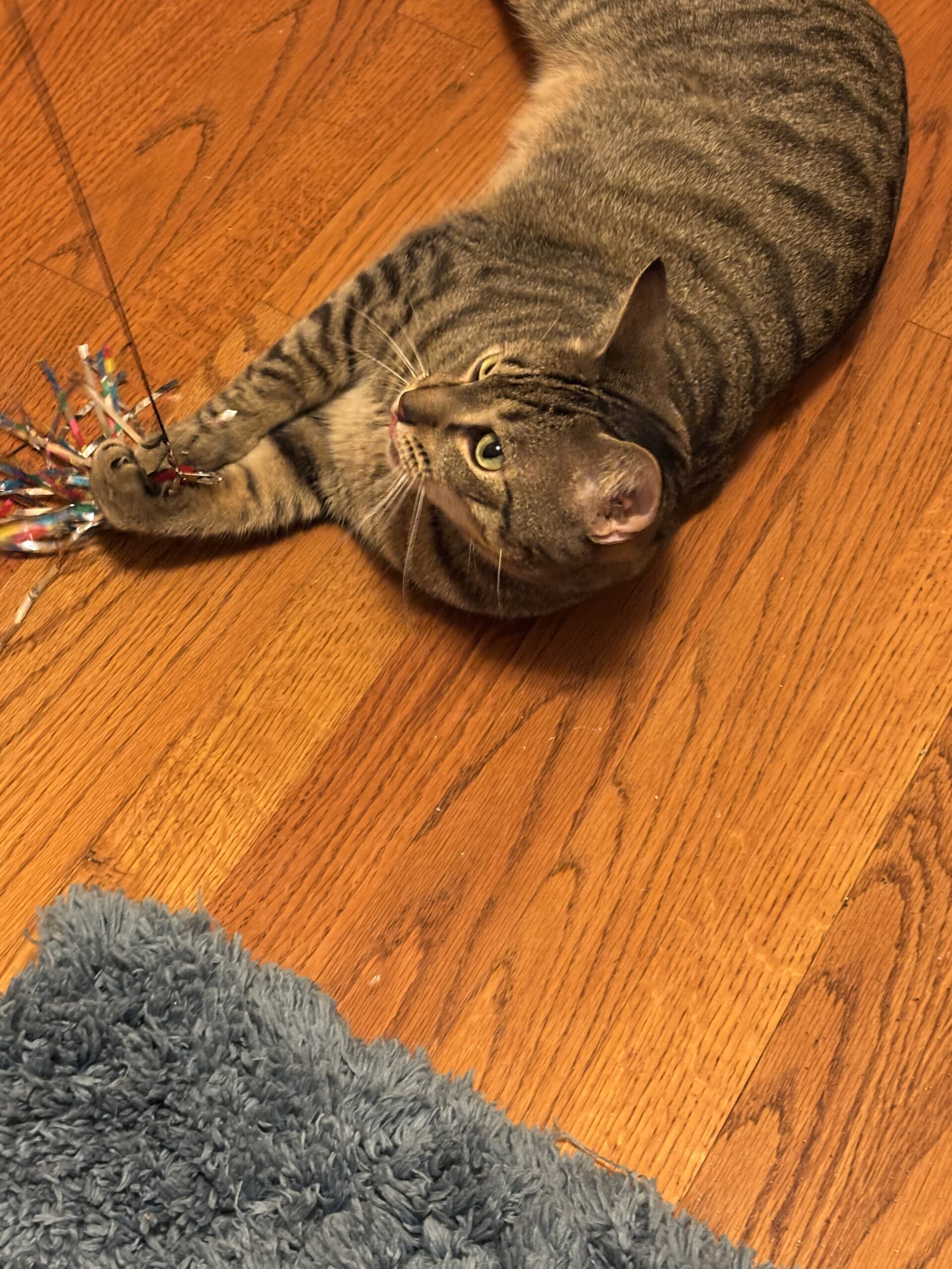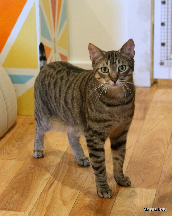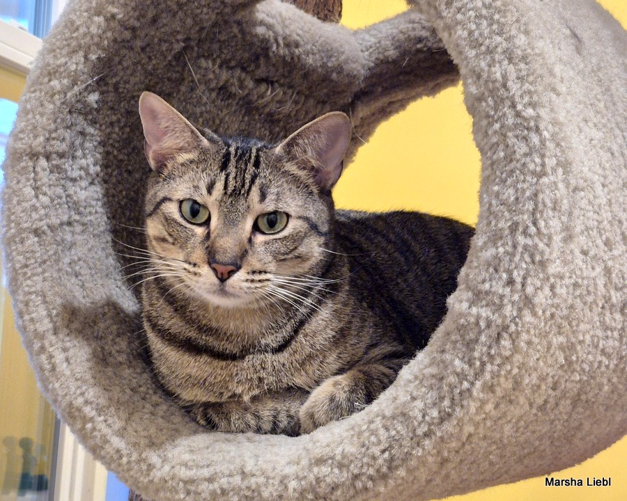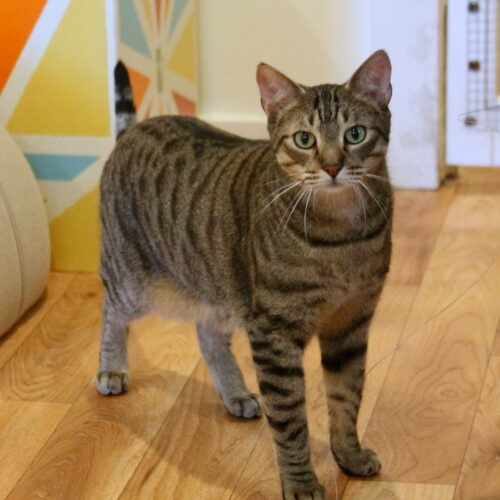 I’m an outgoing guy who loves greeting people, looking out windows, and chasing toys (any toy — I’m not picky!). I especially love zooming through my tunnel or pouncing on strings. I’m also a world-class cuddler — pick me up and I’ll melt right into your arms like a baby.