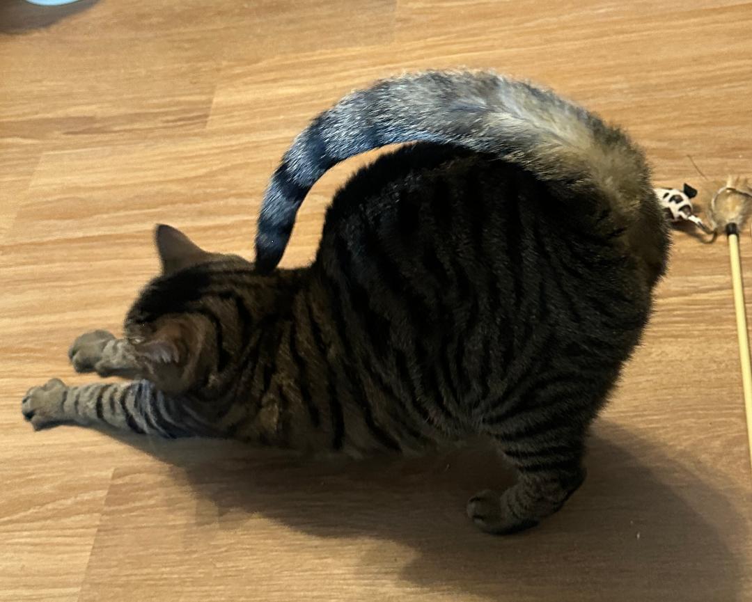 I am a 5 year old gray and black tabby girl and I am still as cute as ever - and affectionate and playful and an all-round great cat. I really love hanging out with adult humans - but not kids or other cats. I will rub against your legs and when you sit down, I will be right there with you. Sometimes, I climb onto your chest for a petting and snuggle session. You can pick me up for a bit but I prefer to move around on my own. I will play with toys like the wand toy, anything with catnip, electronic toys, and I love scratching posts, especially horizontal cardboard ones.